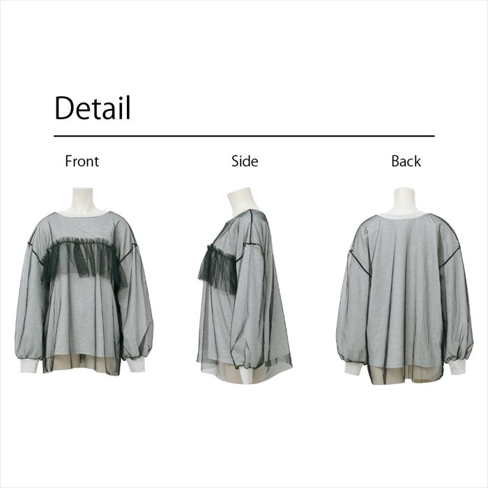 繊細なチュールを全体に重ねた、華やかな印象のクルーネックププルオーバー。フリルデザインとチュールのニュアンスを重ねて立体的なシルエットに仕上げました。すっきりとした印象のクルーネックで抜け感をプラス、同色のチュールなので甘くなりすぎず大人っぽいデザインになっています。たっぷりとしたボリューム袖や程よくゆるっとしたシルエットなど、女性らしさを演出してれます。ドロップショルダーが気になる部分をさりげなくカバーしてくれるのも嬉しいポイントです。【素材】本体:ポリエステル65% 綿35% ・別布:ポリエステル100%【裏地】なし【透け感】なし【伸縮性】あり【原産国】中国■サイズ着丈:72肩幅:60身幅:128袖丈:56裾幅:140※身幅、ウエスト、ヒップ、裾幅、袖口は1周のサイズです。◆注意事項:撮影時のライティングや撮影場所により実際の商品と色味が異なって見える場合がございます。2024/SS/トップス/レディース/カットソー/プルオーバー/