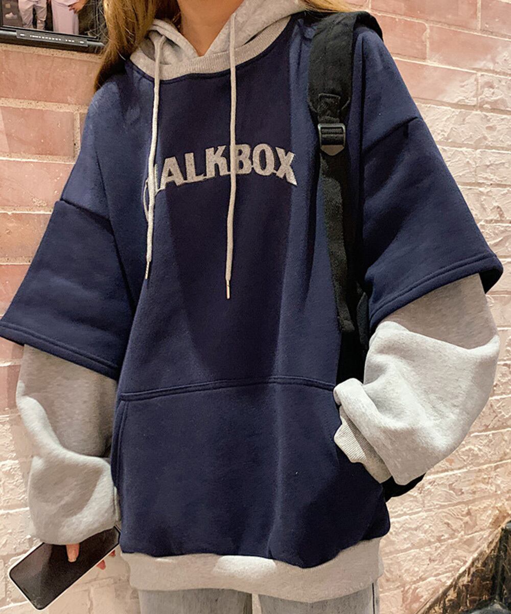 体型カバー 秋冬服 長袖ビッグパーカー 切り替え トップス