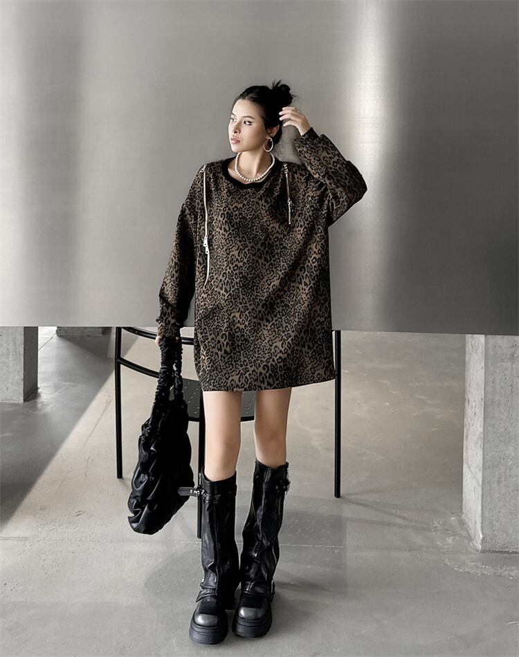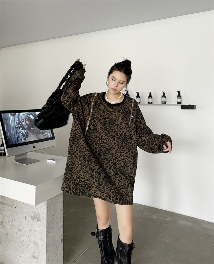 ヒョウ柄 つなぎ ジッパー ラウンドネック 欧米 中長セクション 長袖 上着 パーカー