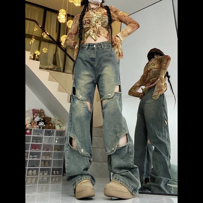 パンツ ボトムス デニム ジーンズ ハイウェスト カットアウト ストレート レディース