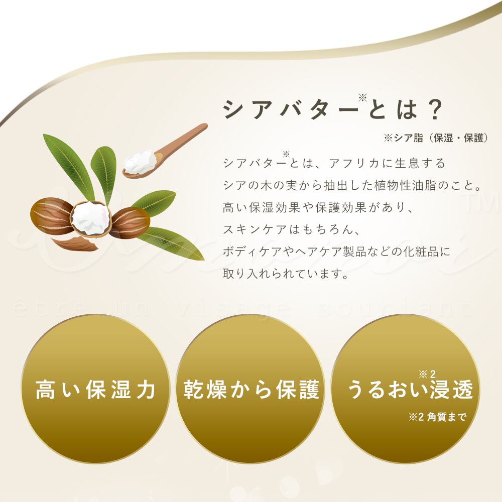 天然由来のシアバターを高配合!たっぷりの美容クリームが肌にうるおいを与え、乾燥を防ぎます。